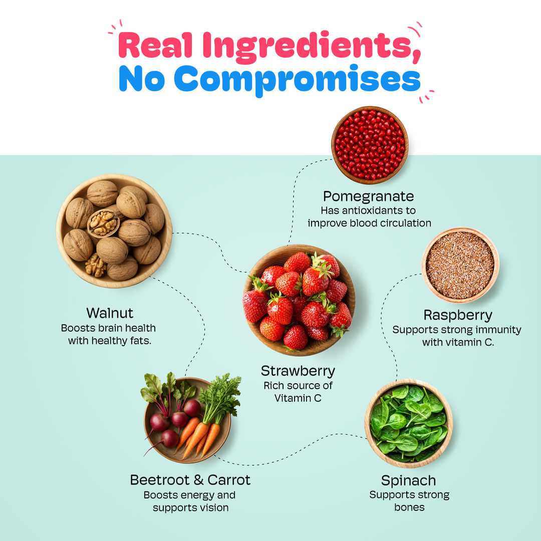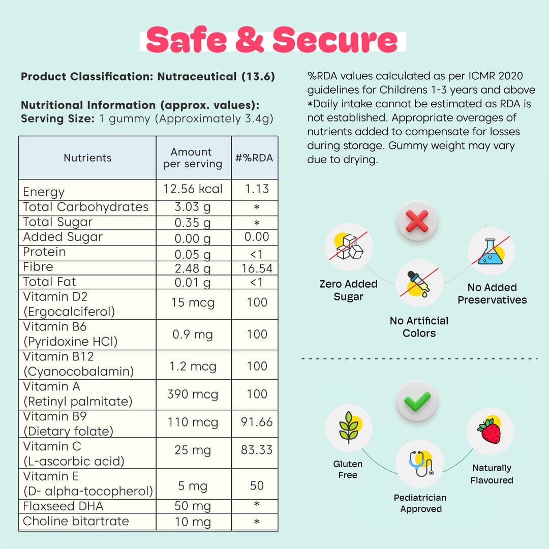 ✅ Powered by DHA (Omega 3) & Choline + with 8 nutrients and 4 delicious fruits and veggies.